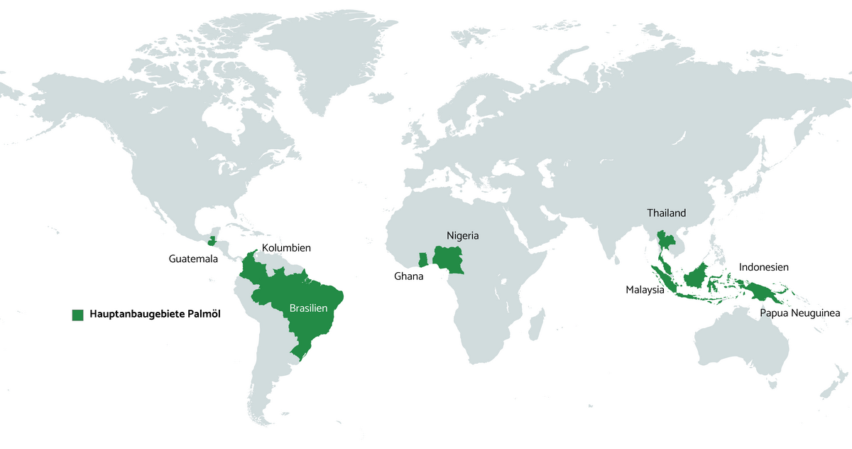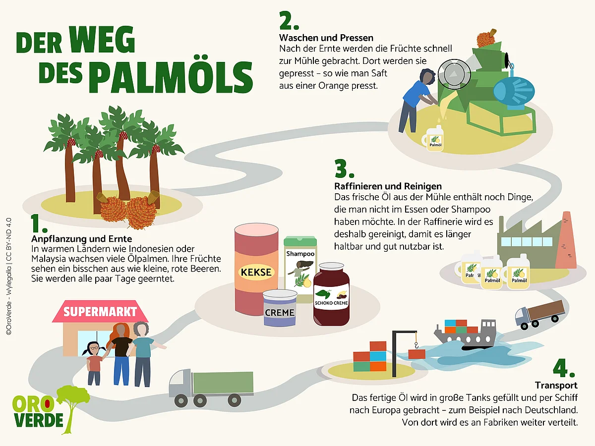 Den Namen „Palmöl“ habt ihr bestimmt schon einmal gehört oder auf einer Zutatenliste gelesen. Es steckt in vielen Lebensmitteln wie Schokolade, Chips, Keksen, Margarine oder Erdnussbutter. Aber auch in Shampoo, Seife, Waschmittel und sogar in Medikamenten ist oft Palmöl enthalten. Im Supermarkt begegnet es uns also sehr häufig. Doch wo kommt Palmöl eigentlich her und aus welcher Pflanze wird es gewonnen?