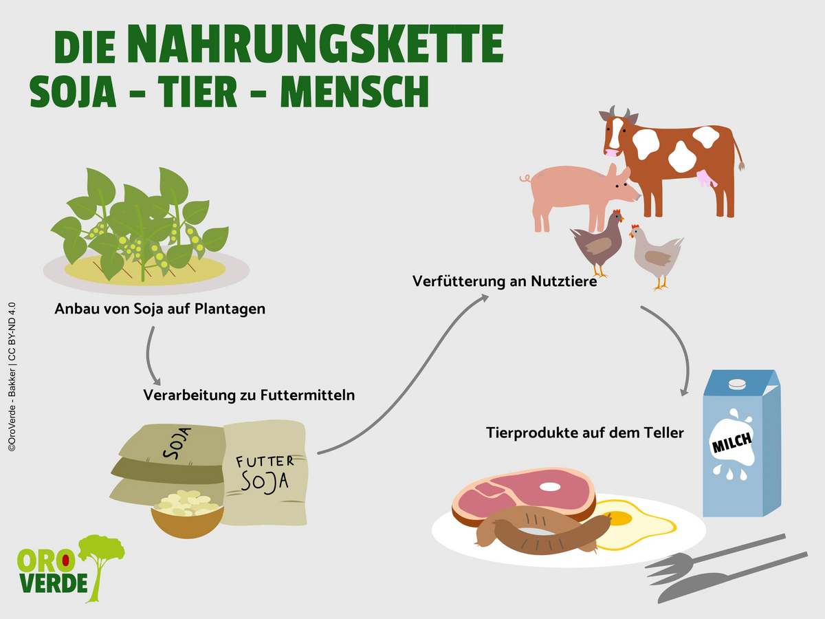 Bildnachweise: ©GettyImages/unsplashplus und Özi´s Comix Studio, GettyImages/unsplashplus, Mapchart/OroVerde, E.Bakker/OroVerde (Schaubild Nahrungskette Soja), S.Wylegalla/OroVerde (Schaubild Lieferkette Soja)