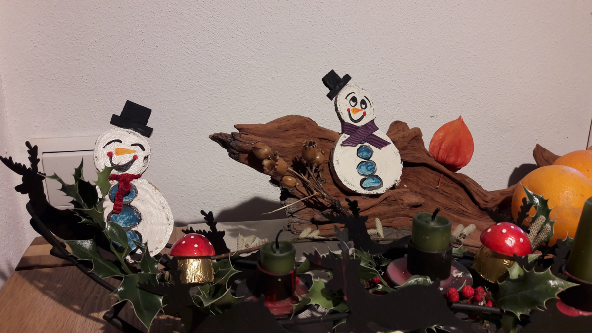 Schneemänner (-frauen) aus Holzscheiben