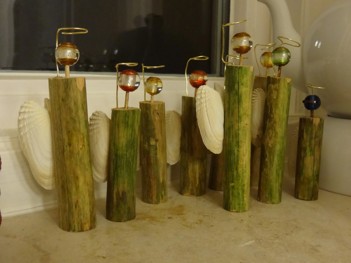 Du hast aus dem Sommerurlaub noch Muscheln, mit denen du nichts anzufangen weist? Dann haben wir eine tolle Idee für dich: Engelchen aus Ästchen mit Perlen als Köpfe und Muscheln als Flügel!