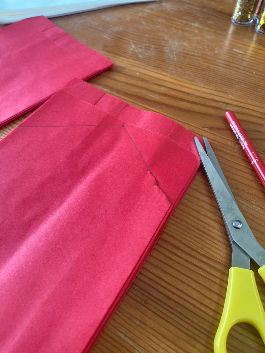 - Schneide oben eine Spitze oder Muster in die Tüten – wie bei einem Schneeflocken-Schnitt. Dabei kann dir das Lineal mit gerade Linien helfen.